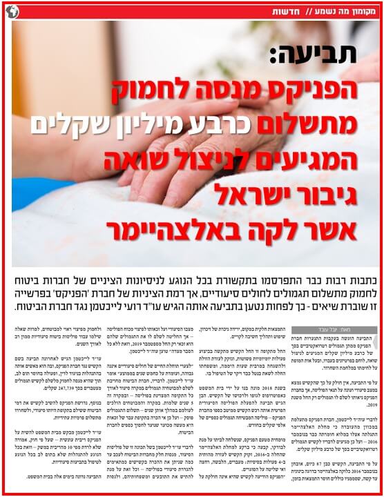 תביעה: ‘הפניקס’ מנסה לחמוק מתשלום כרבע מיליון שקל המגיעים לניצול שואה גיבור ישראל אשר לקה באלצהיימר